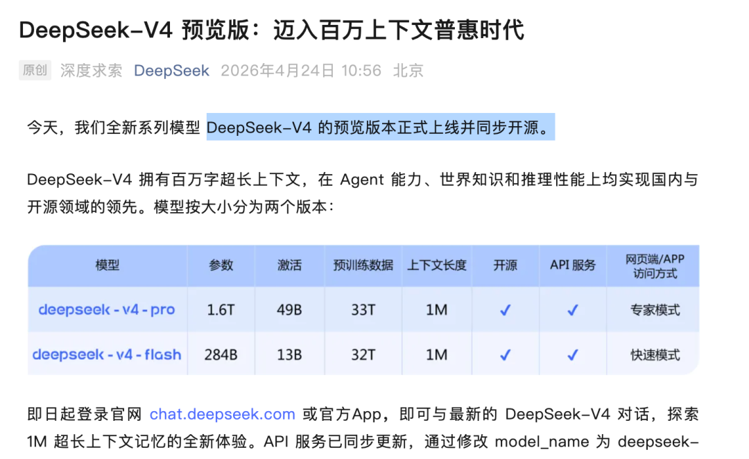 就在今天,DeepSeek 团队发布了备受期待的 DeepSeek-V4 系列——包括 1.6T 总参数的 V4-Pro 和 284B 的 V4-Flash,两款模型均原生支持 100 万 token 的超长上下文,且已完全开源。
